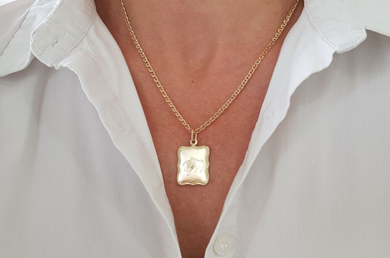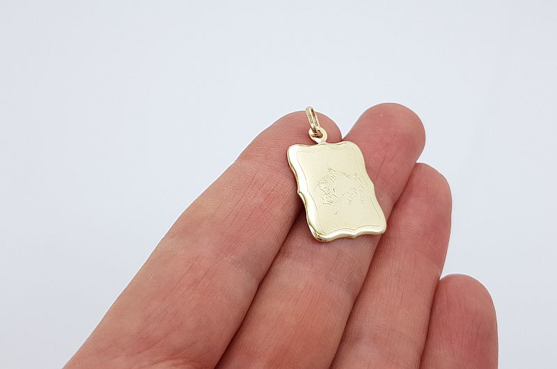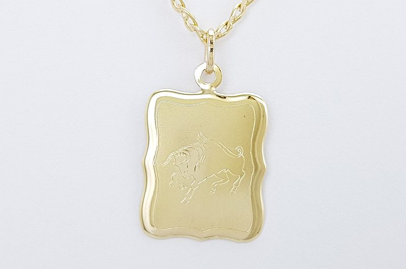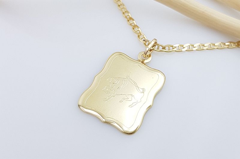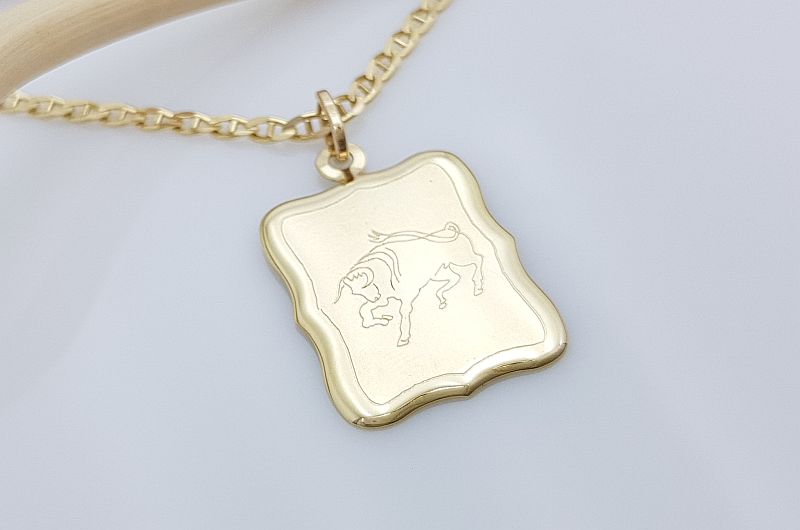 Obesek je izdelan v obliki pravokotne ploščice. Na sprednji strani je matirana in ima vgravirano astrološko znamenje bika, na zadnji strani pa je gladka, svetleča.