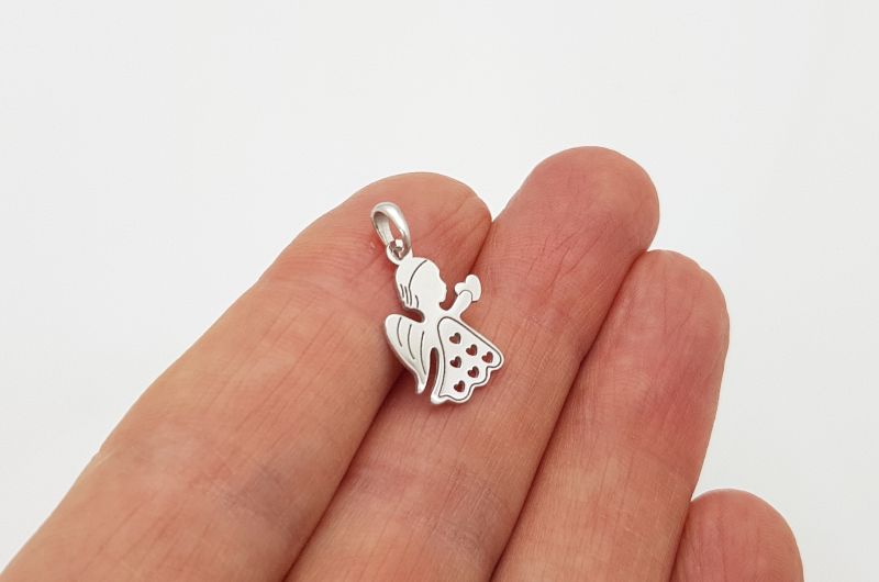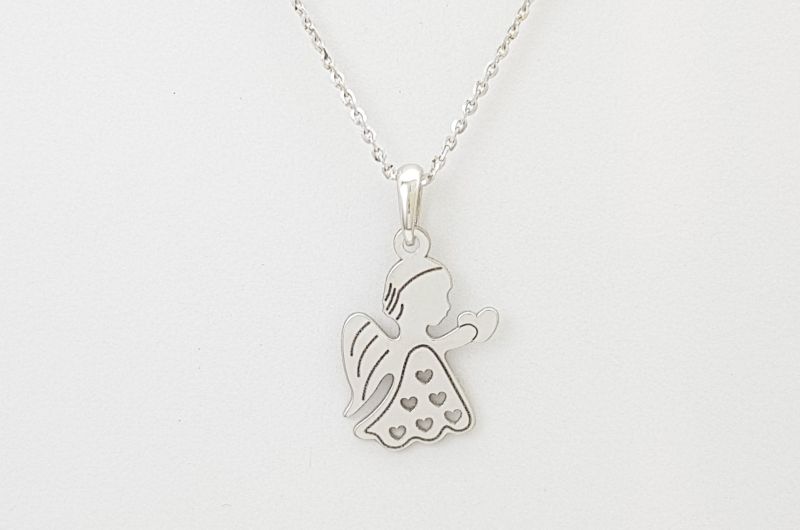 Obesek je izdelan v obliki angela. V celoti je gladek. Po obleki ima izrezljane srčke.