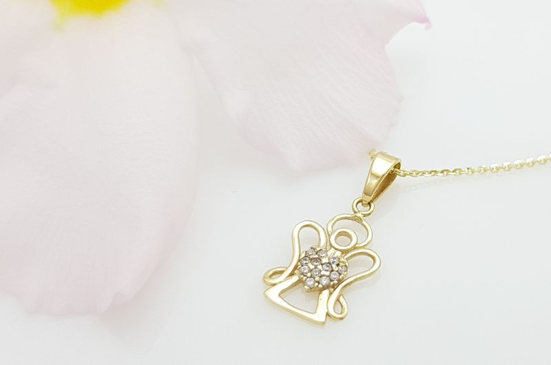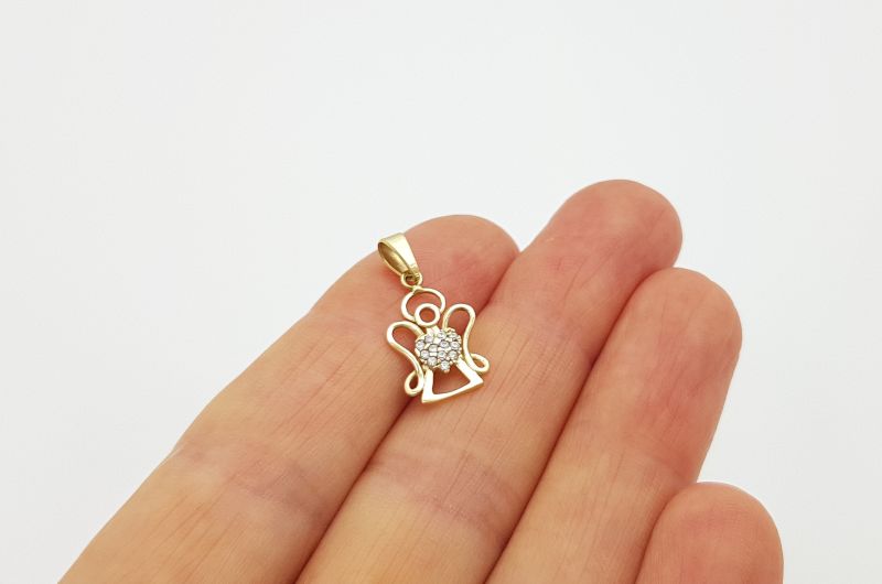 Obesek je izdelan v obliki angela. Na sredini ima v srček vkovane svetleče cirkone. Zlato je gladko, svetleče.
