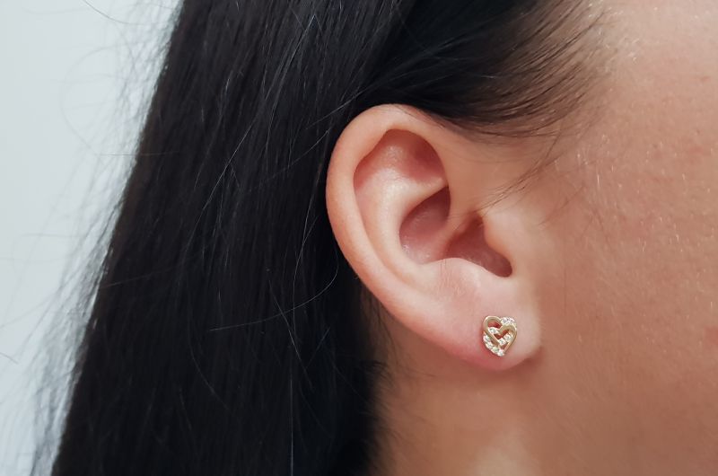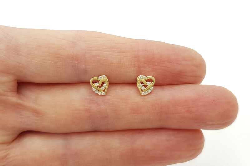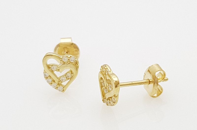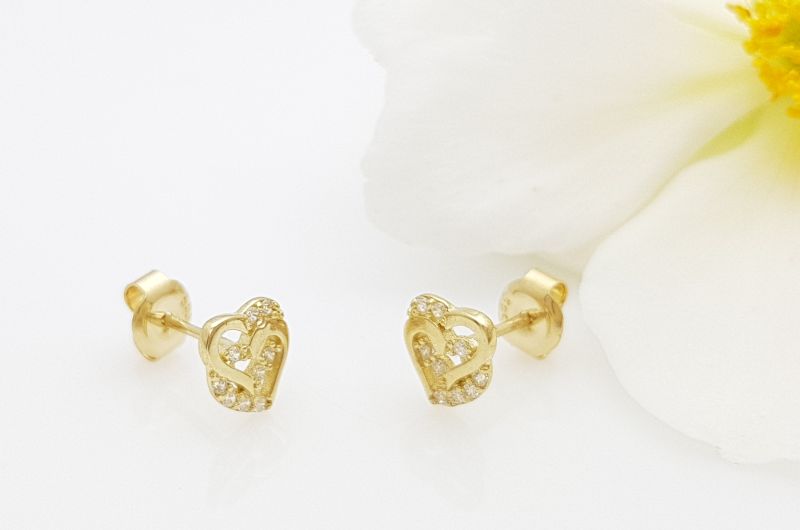 Uhani so izdelani v obliki dveh prepletenih src, na katerih se izmenjujeta gladki površini in površini z vkovanimi svetlečimi cirkoni. Zapirajo se z metuljčkom.