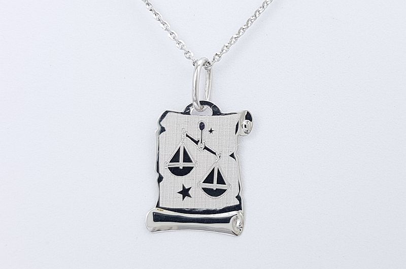 Obesek je izdelan v obliki papirusa. Na sprednji strani je matiran in ima vgravirano astrološko znamenje tehtnice, na zadnji strani pa je gladek, svetleč.