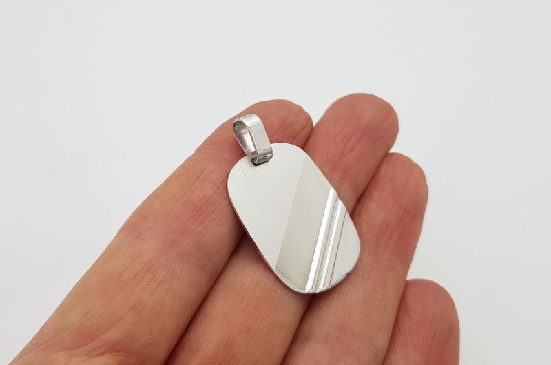 Obesek je izdelan v obliki pravokotne ploščice, z zaobljenimi robovi. Sprednja stran je gladko matirana, z dvema rahlo izbočenima črtama po diagonali. Zadnja stran je v celoti gladka.