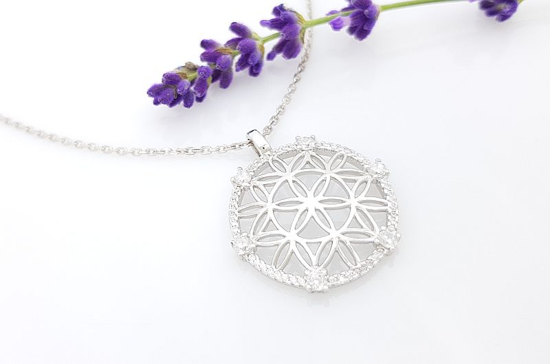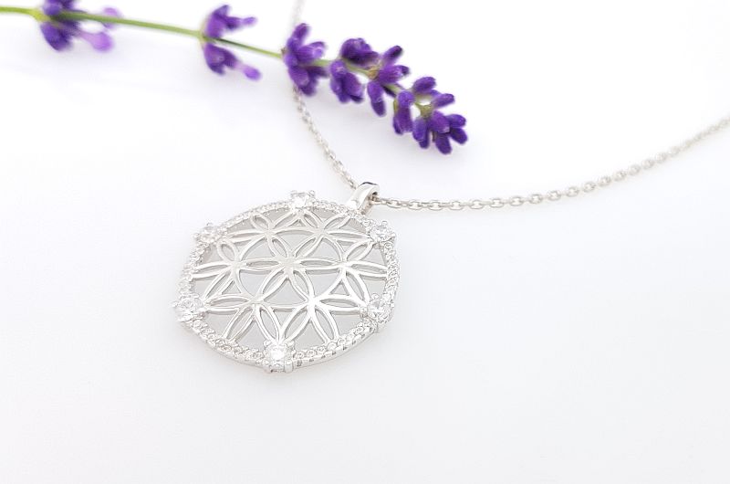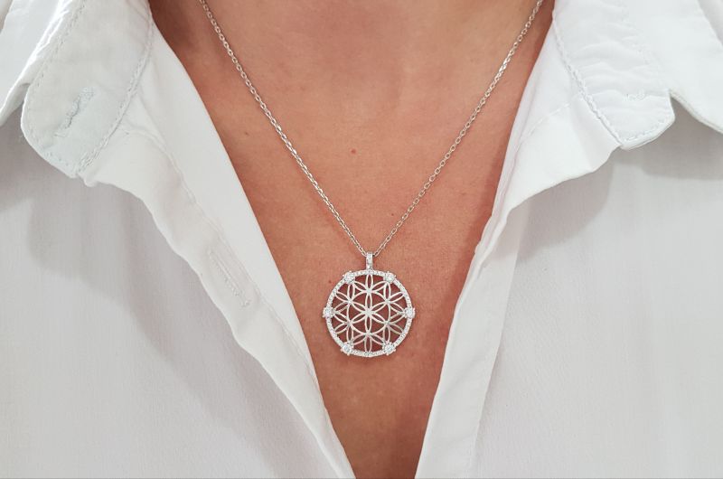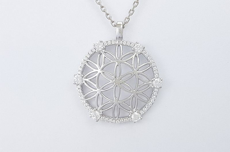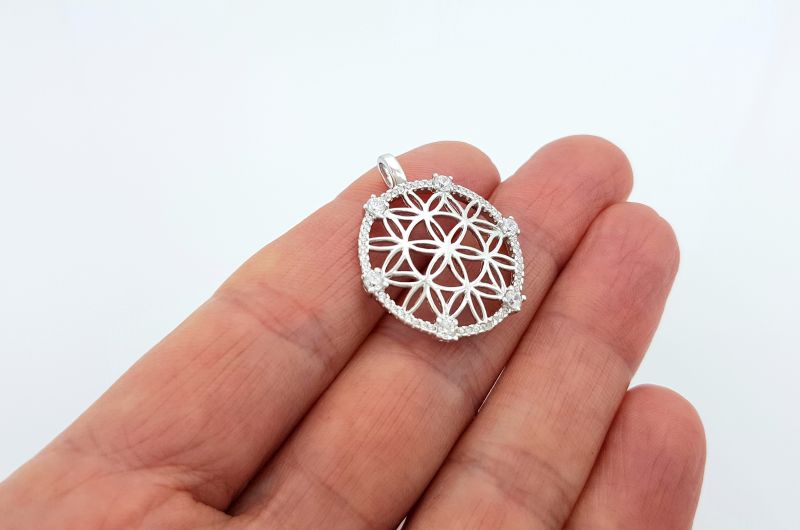 Obesek je izdelan v obliki mandale, ki spominja na rožo. Notranja površina je gladka, po robu pa so vkovani manjši in večji svetleči cirkoni. Obesek je zaščiten z belo prevleko, oziroma rodijem, da je dalj časa odporen proti zunanjim vplivom, ki povzročajo oksidacijo ali potemnitev.