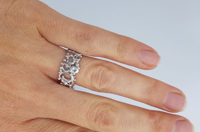 Prstan je izdelan iz vitic in kroglic, ki mu dajejo videz krone. V celoti je gladek, svetleč.