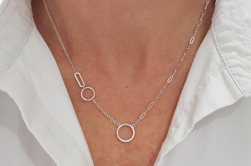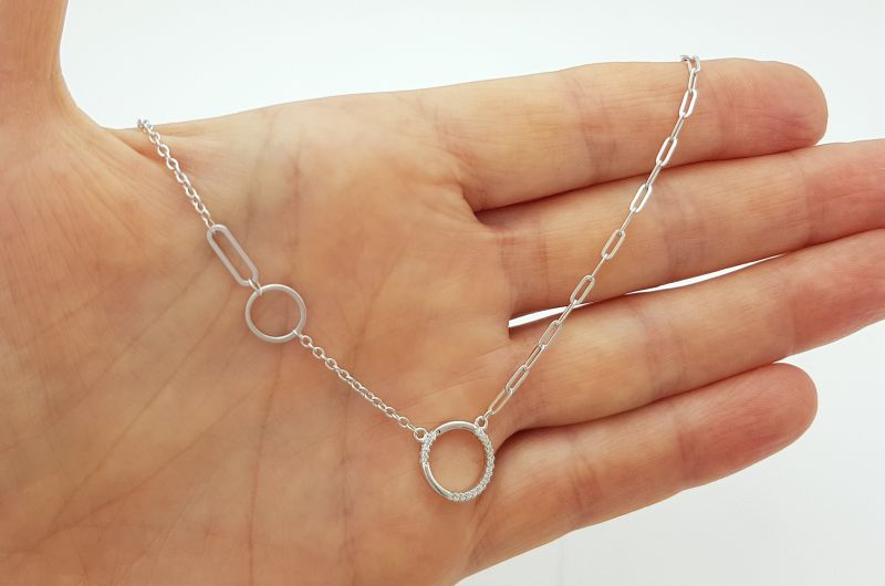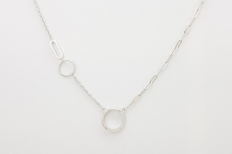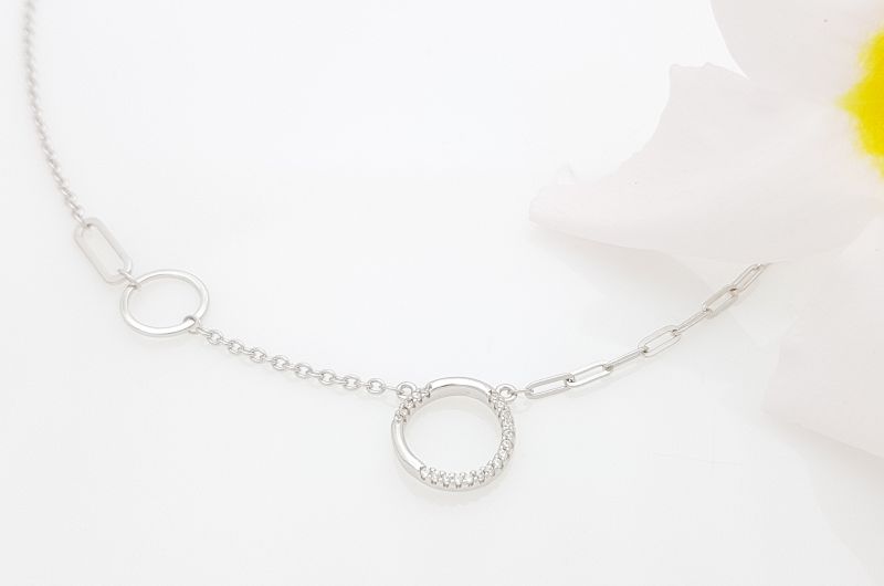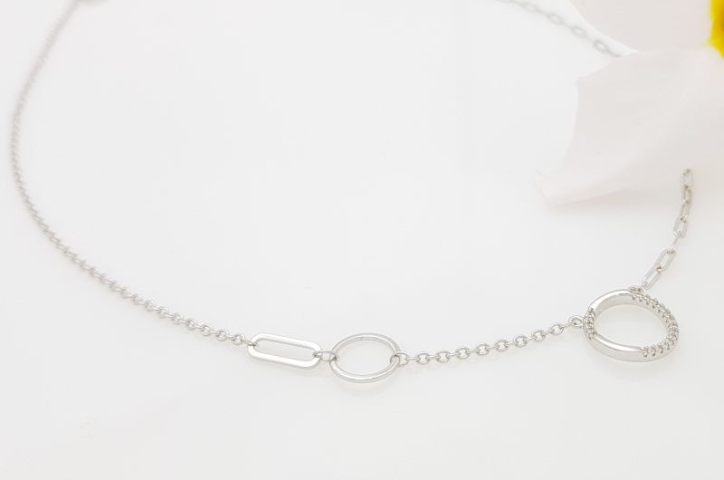 Verižica je izdelana iz različnih vzorcev pletenja. Na srednjem delu je vstavek v obliki kroga, s svetlečimi cirkoni. Poleg njega sta dva manjša, gladka elementa, v obliki kroga in pravokotnika. Verižica je prevlečena z belim zlatom, da ne potemni in je dalj časa obstojna. Na koncu so členi, za prilagajanje dolžine. Zapira se s karabinom.