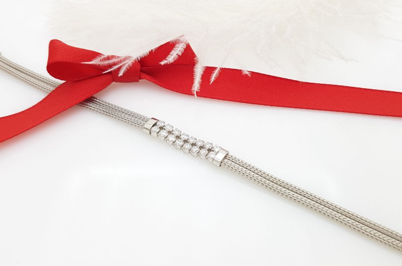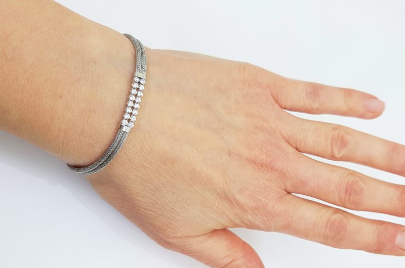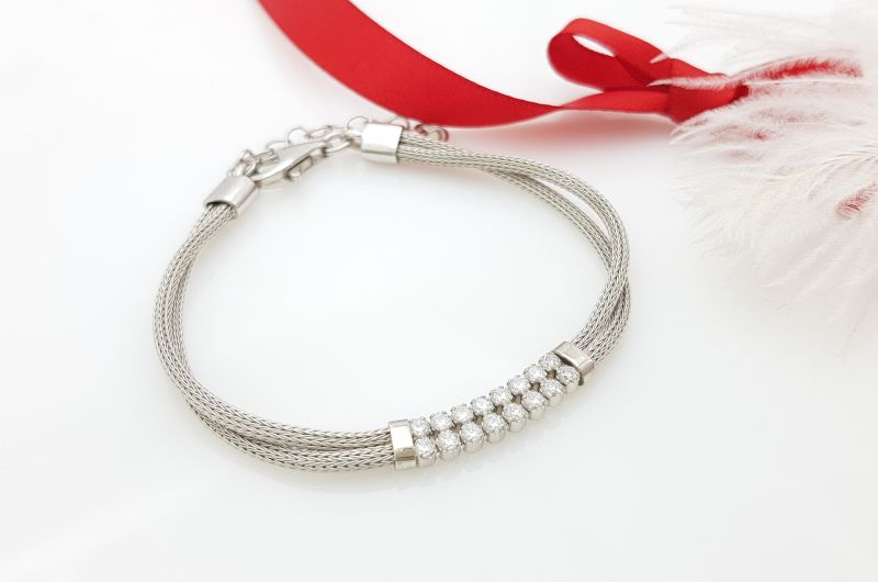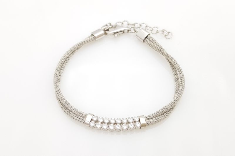 Zapestnica je izdelana iz drobnih členov, ki so med seboj povezani v gosto dvojno pletenje. Na sredini je v dve vrsti vkovanih po osem okroglih cirkonov, s premerom 2 mm. Zapestnica je rodinirana- prevlečena z belo prevleko, da ne oksidira in je dalj časa obstojna. Na koncu, so členi, za prilagajanje dolžine. Zapira se s karabinom.