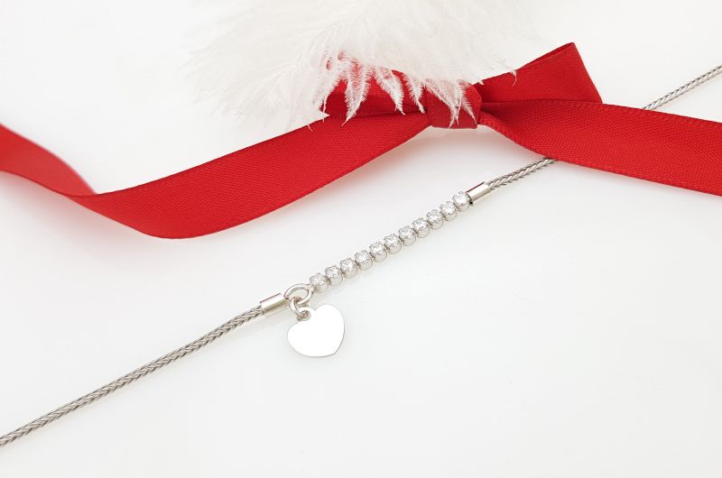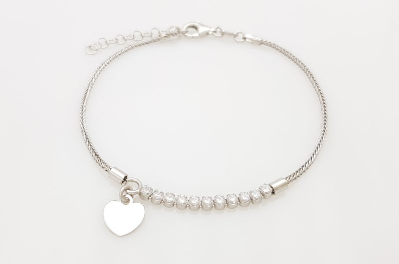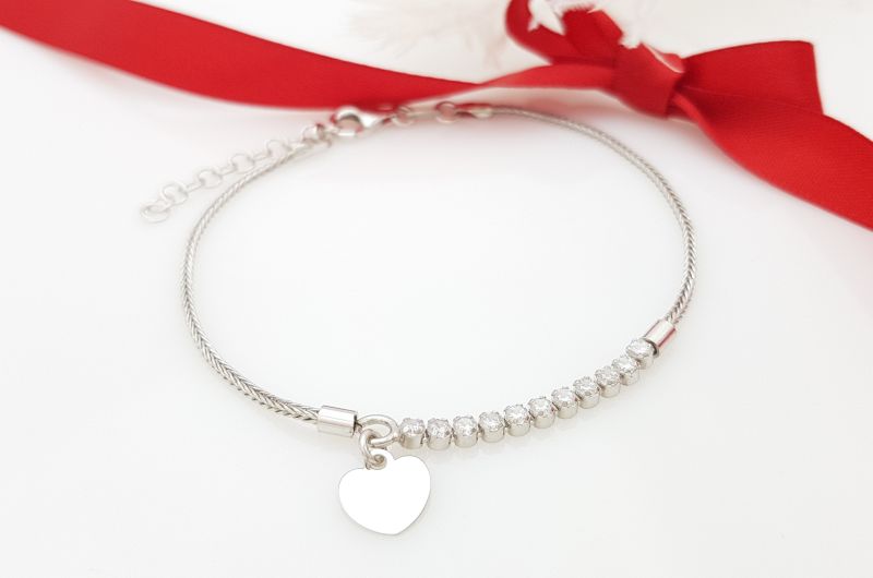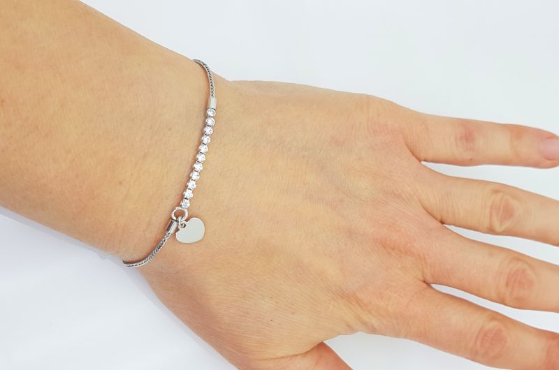 Zapestnica je izdelana iz drobnih členov, ki so med seboj povezani v gosto pletenje. Na sredini je 10 okroglih cirkonov, s premerom 2 mm. Na koncu kolone cirkonov, visi gladko srce, v velikosti 8×7 mm, kamor lahko dodamo gravuro (doplačilo). Zapestnica je rodinirana- prevlečena z belo prevleko, da ne oksidira in je dalj časa obstojna. Na koncu, so členi, za prilagajanje dolžine. Zapira se s karabinom.
