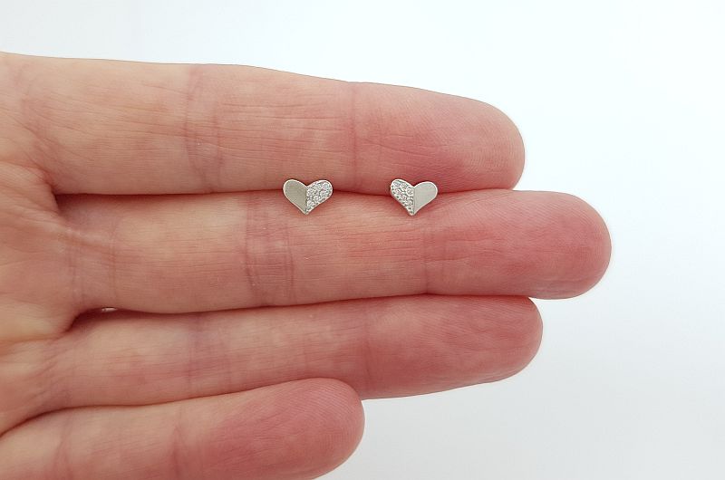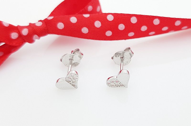 Uhani so izdelani v obliki srca. Polovica je gladka, po drugi polovici so vkovani bleščeči cirkoni. Zapirajo se z metuljčkom.