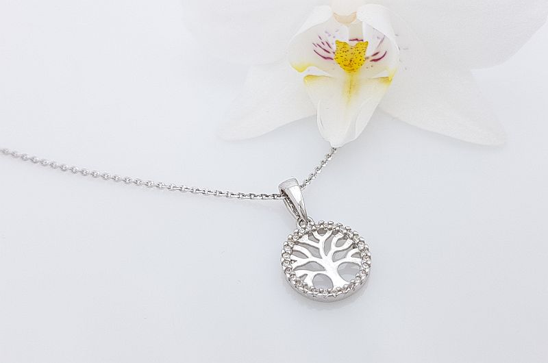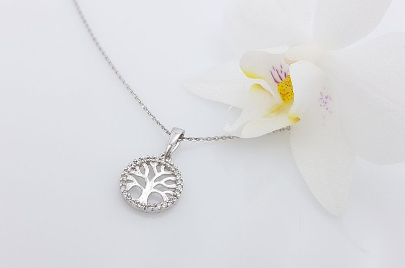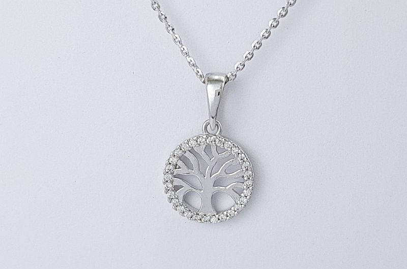 Obesek je okrogle oblike, premera 11 mm. Po obodu, so vkovani cirkoni, v sredini pa je sijoče drevo življenja.