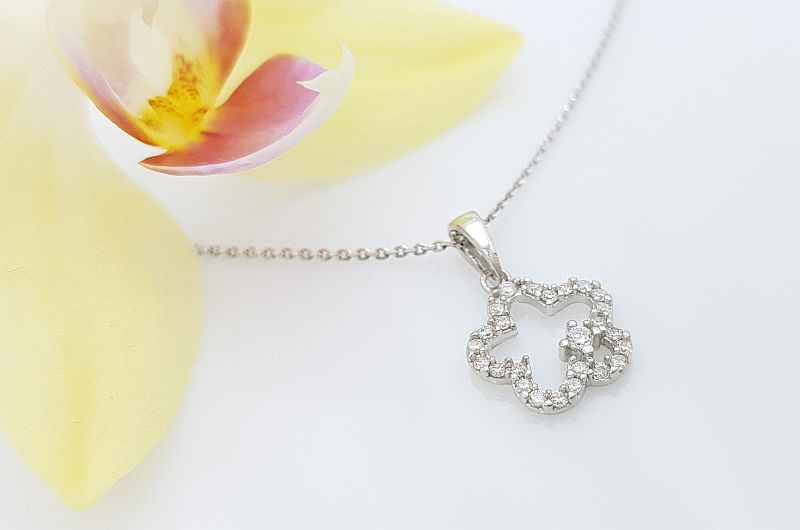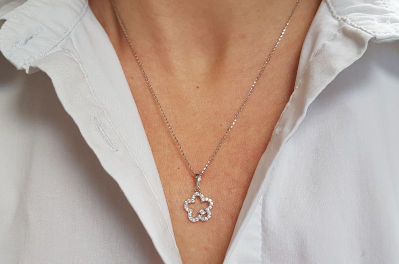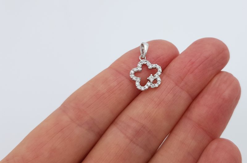 Obesek je izdelan v obliki rože. Po obodu ima vkovane cirkone. V sredini je prazen prostor, vkovan je le en, malo večji cirkon.