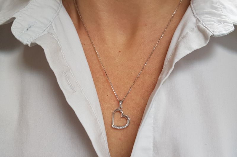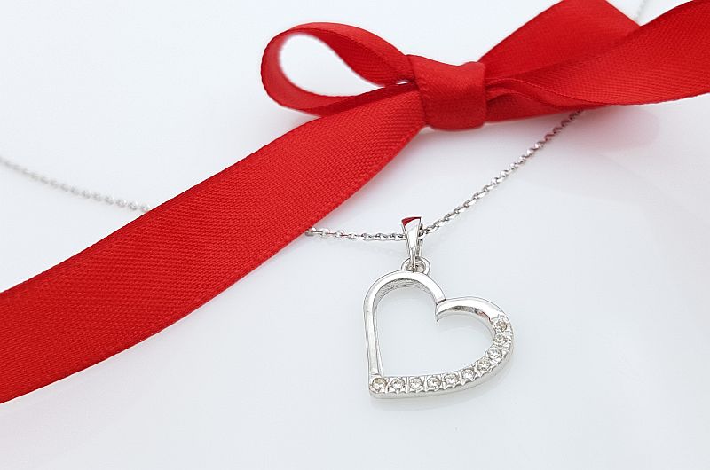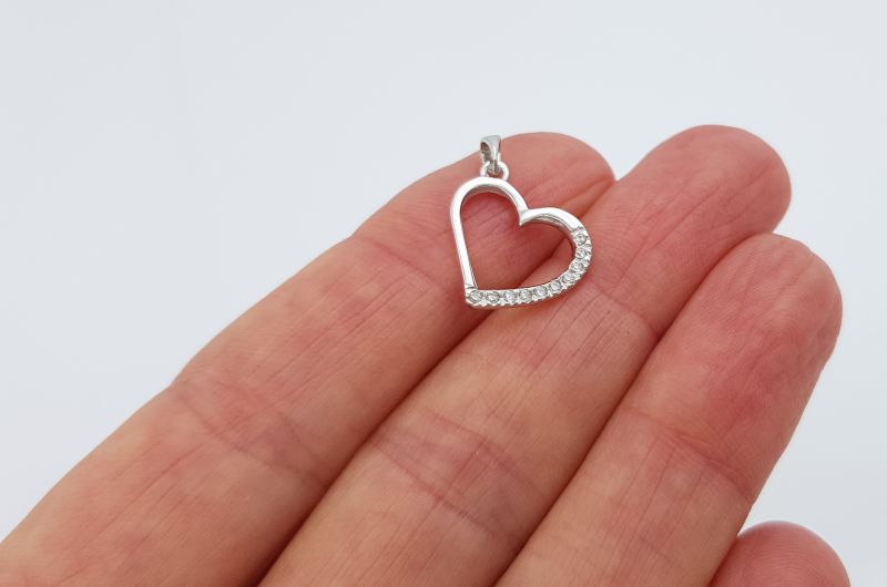 Obesek je izdelan v obliki srca. Po enem delu oboda, so vkovani cirkoni, druga stran je gladka, svetleča. Na sredini je prazen prostor.