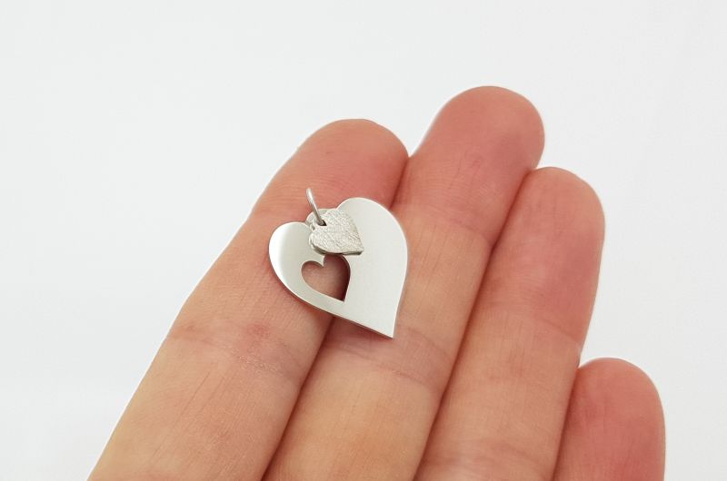 Obesek je izdelan v obliki srca. Večje srce je na obeh straneh gladko. V desnem kotu je izrezano manjše srce, ki visi poleg velikega. To malo srce je v celoti matirano.