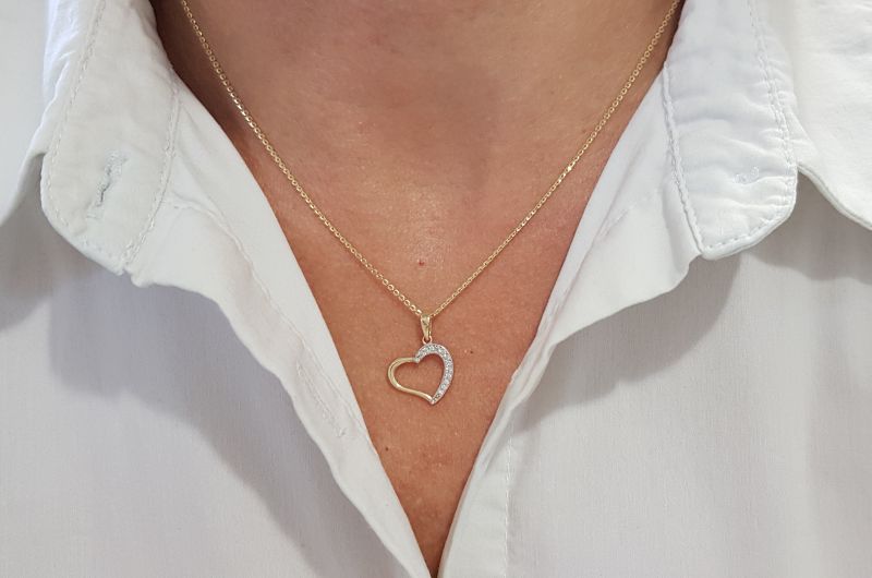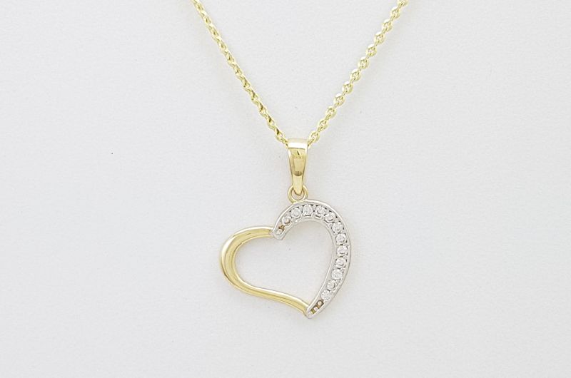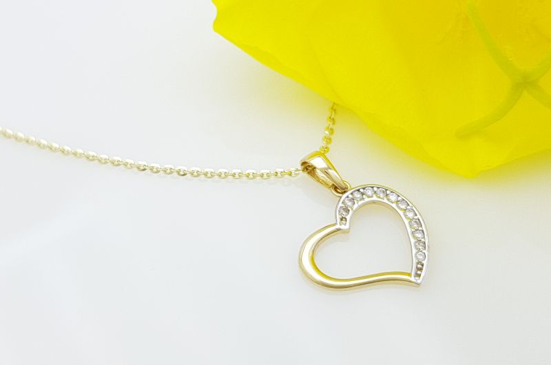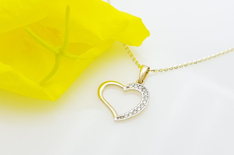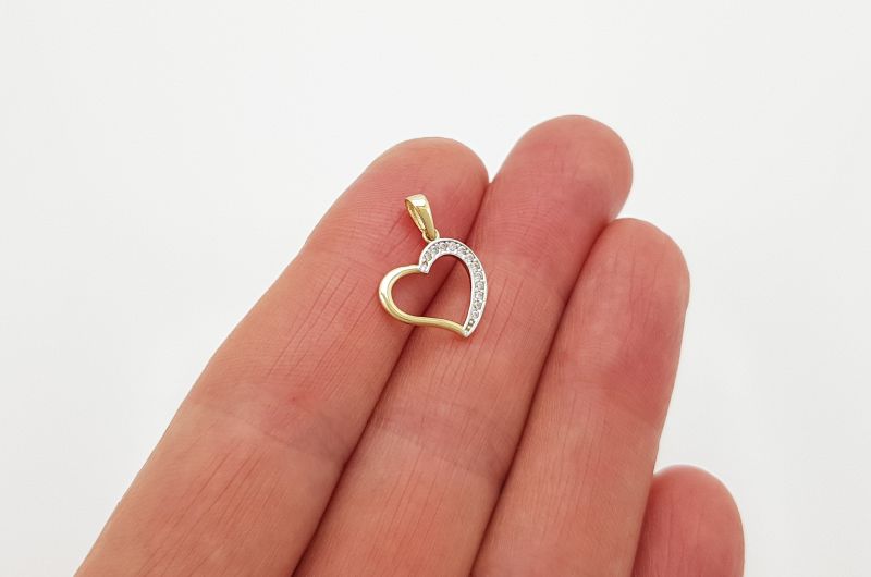 Obesek je izdelan v obliki srca. Po enem delu oboda, so vkovani cirkoni, druga stran je gladka, svetleča. Na sredini je prazen prostor.