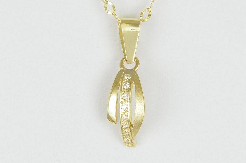 Obesek je izdelan iz treh rahlo napetih površin. Sredinska ima vkovane cirkone, ena stranska je gladka, svetleča, druga pa matirana.