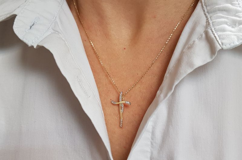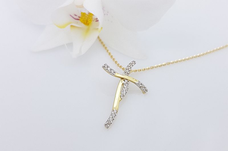 Obesek je izdelan v obliki križa. Linije so rahlo valovite in med seboj prepletene. Na krakih, so vkovani svetleči cirkoni. Zlato je gladko, svetleče.