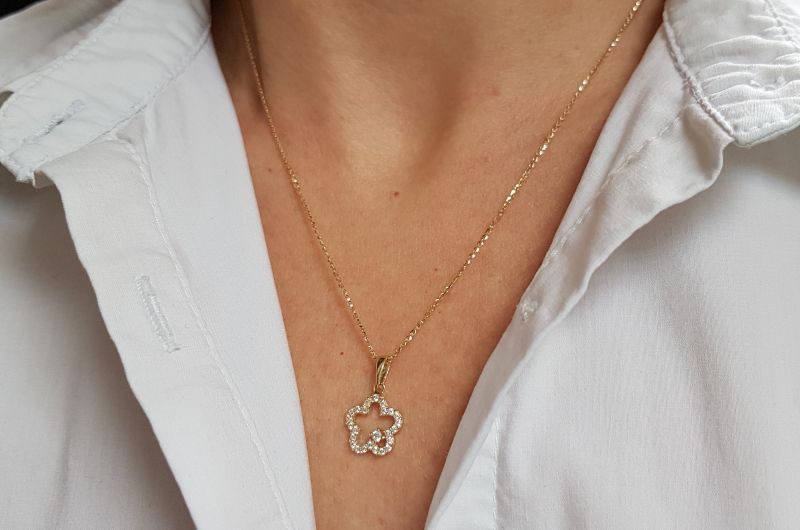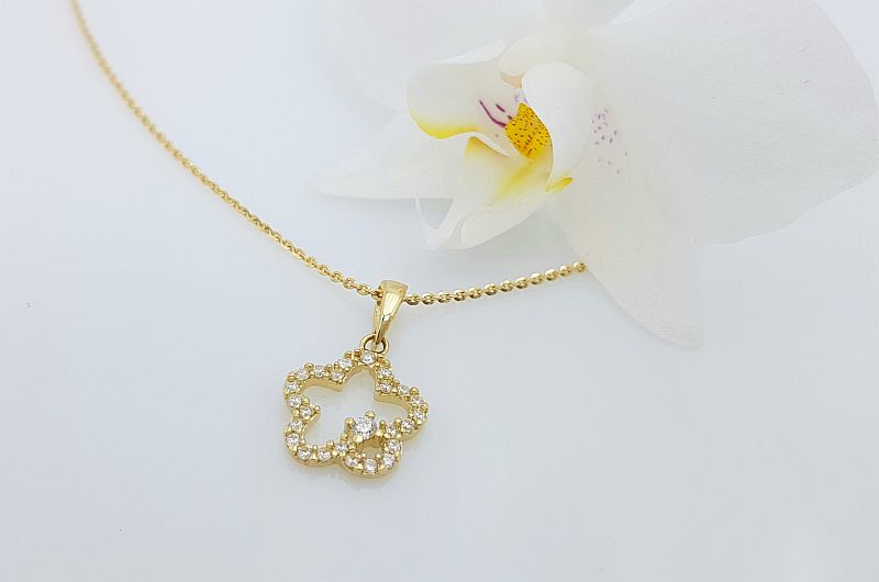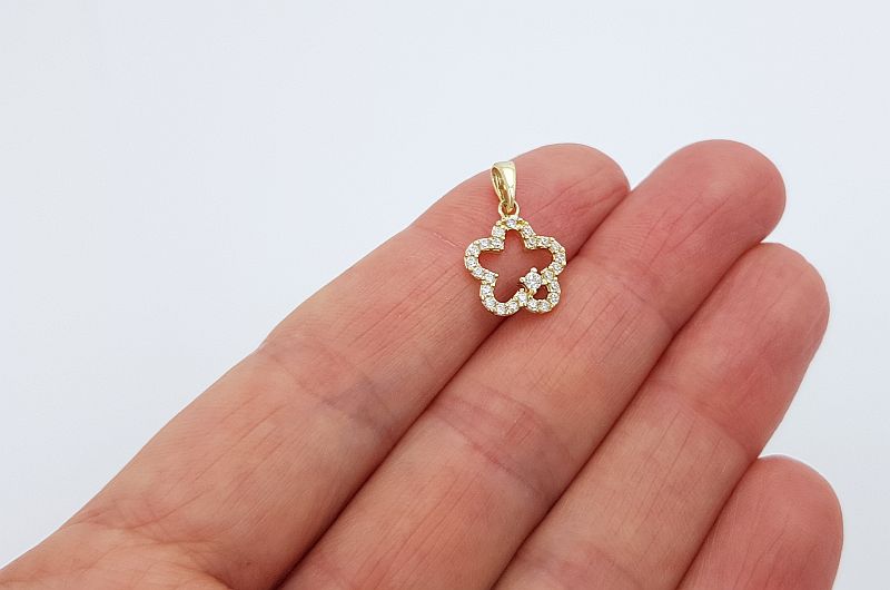 Obesek je izdelan v obliki rože. Po obodu ima vkovane cirkone. V sredini je prazen prostor, vkovan je le en, malo večji cirkon.